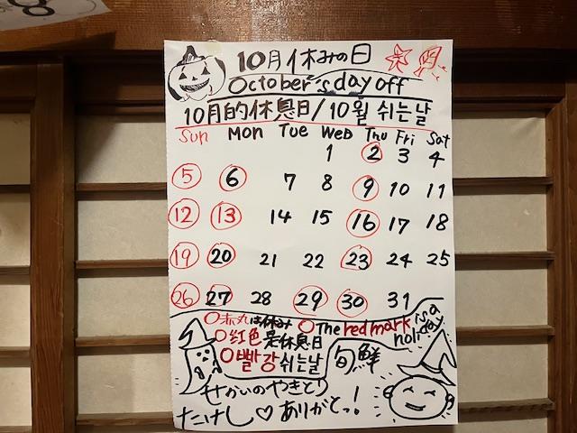 ■10月の休みの日をお知らせします。
